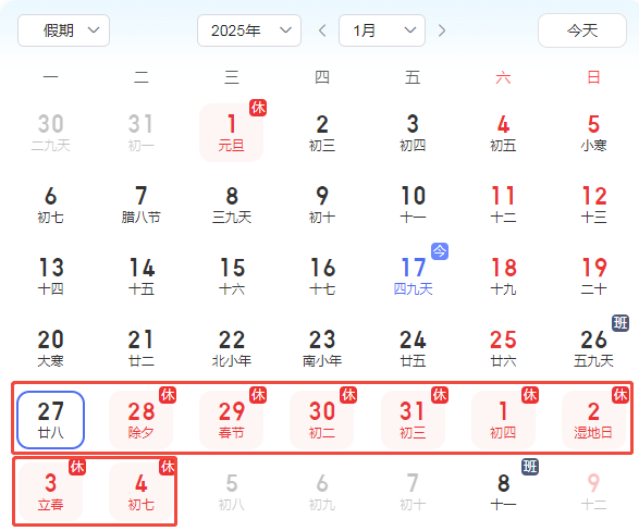2025年1月27日 (星期一)至2月4日(星期二),放假時(shí)間為9天。1月26日(星期天)、2月8日星期六為調(diào)休時(shí)間公司正常上班。