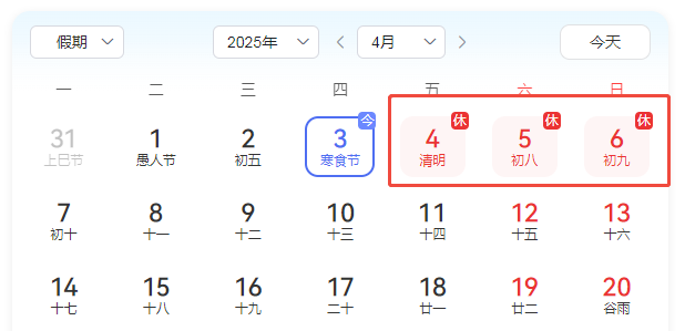 清明節(jié)假期將至,根據(jù)國家節(jié)假日放假規(guī)定并結(jié)合公司的實際情況,公司特將2025年清明節(jié)放假做以下安排: